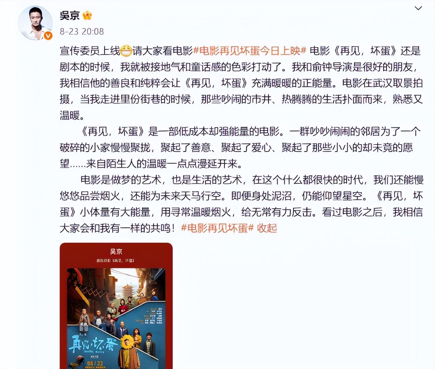 8月22日,吴京投资出品并客串演出的电影《再见,坏蛋》登陆暑期档。