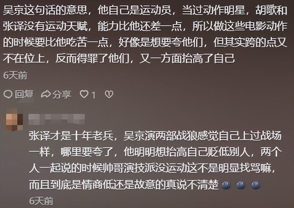 但吴京毫无收敛,甚至还阴阳起了身旁的张译和胡歌。