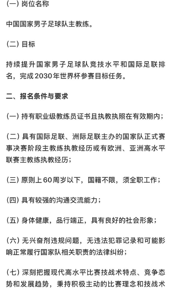 北京时间9月5日,中国足协发布公告,公开选聘中国男足国家队主教练。而足协对于新任国足主帅提出了7项条件。