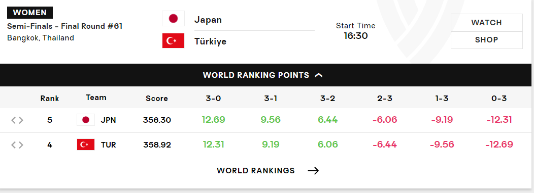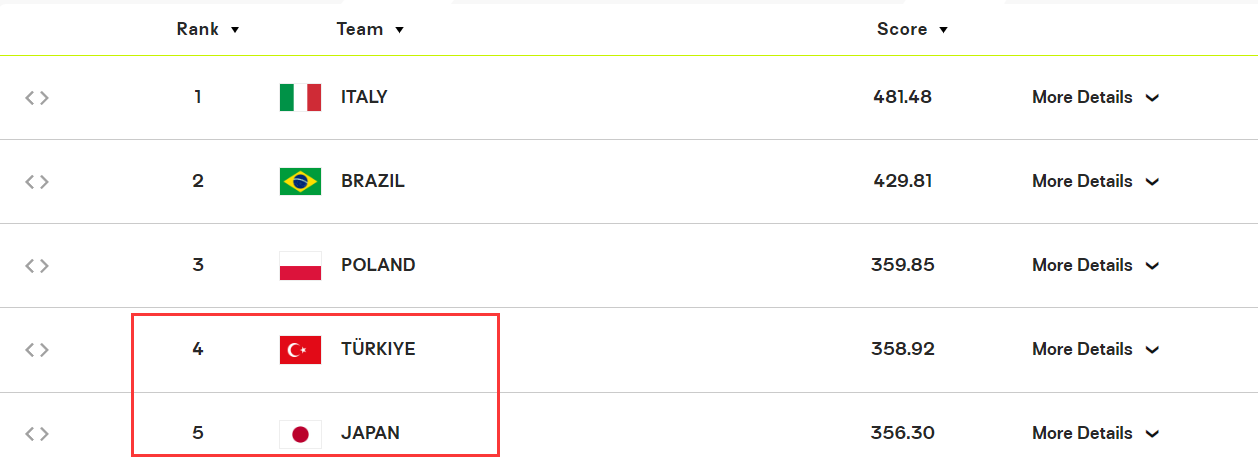 值得一提的是日本女排世界排名第五(356.30),土耳其女排世界排名第四(358.92),波兰女排世界第三(359.85)。